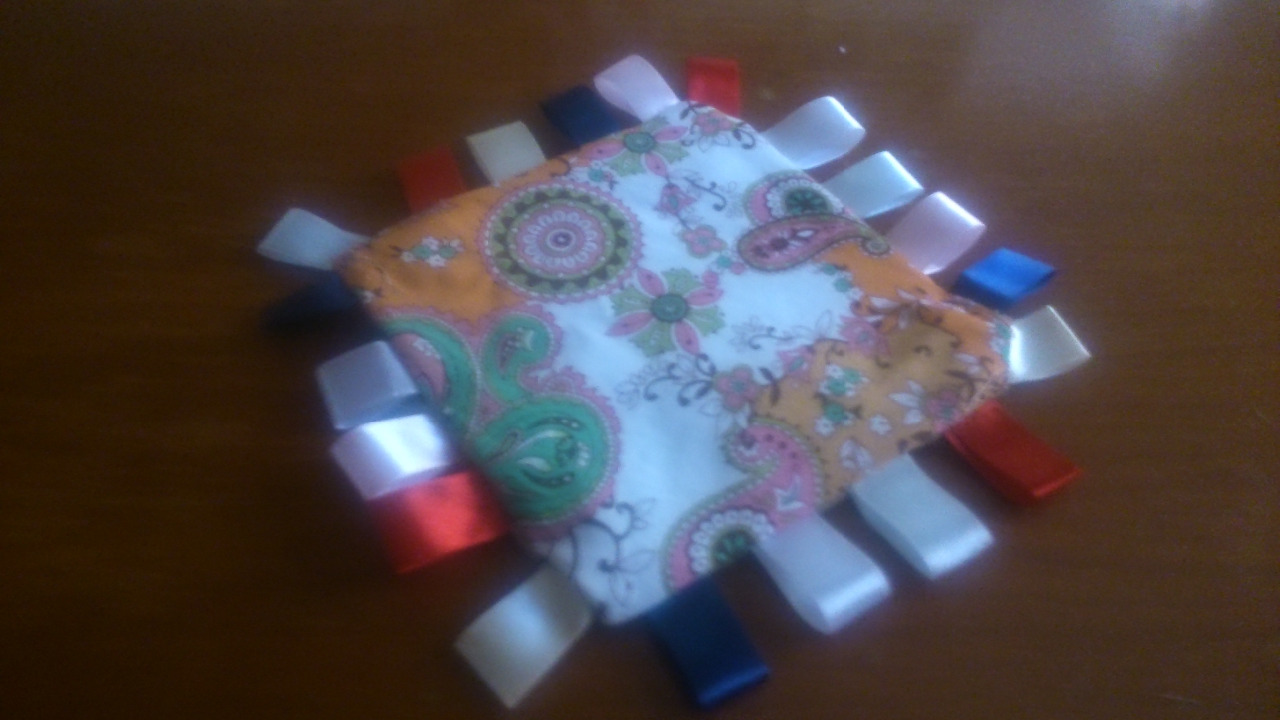A színes szalagokat 8 cm-es darabokra vágjuk, majd az egyik anyagon elhelyezzük egyenlő távolságokra, és így varrjuk a színére. A másik oldal sarkaiba pedig a kis bogyós zacskókat.